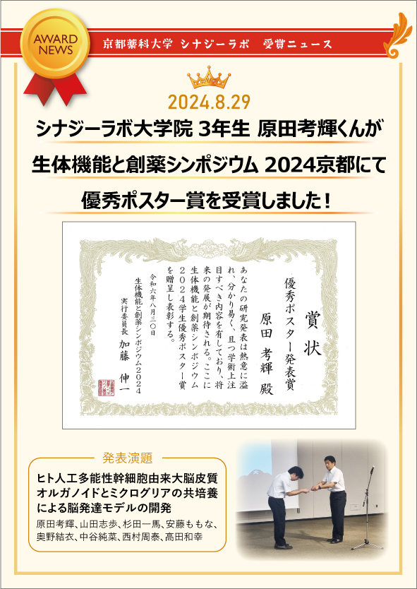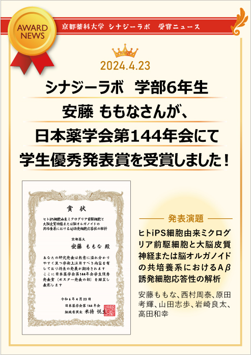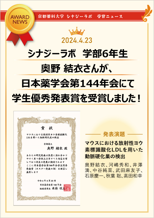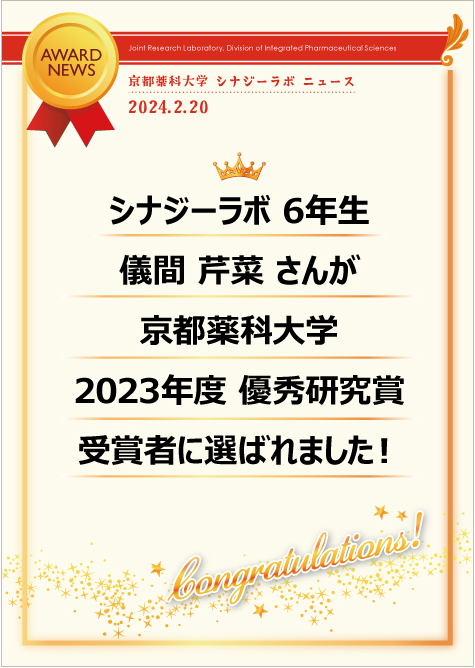 | 2024.2.20 Serina Gima, a sixth-year student at Joint Research Laboratory, has been selected as the recipient of Kyoto Pharmaceutical University's 2023 Outstanding Research Award. |