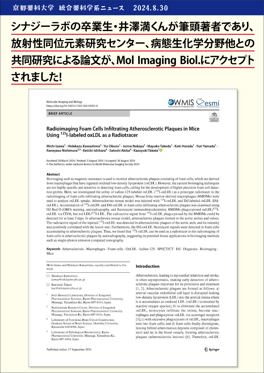 2024.8.30 A paper written by Michi Izawa, a graduate of Joint Research Laboratory, as the first author in collaboration with the Radioisotope Research Center, Laboratory of Pathological Biochemistry, and others has been accepted for publication in Mol Imaging Biol. |