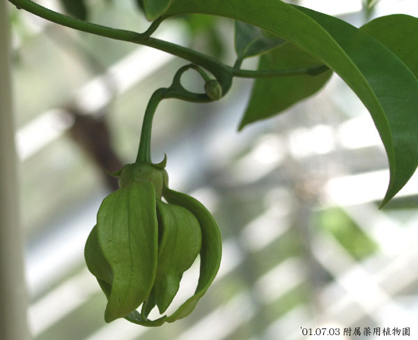 | 鳥の爪に似ているフックを持つところから日本名は「鶯爪花(オウソウカ)」、中国名は「鷹爪花」と表記される。また、茎から出ているフックを木の枝などに引っ掛け太陽を求め、上へ上へとよじ登って行く姿から、「クライミング・イランイラン」とも呼ばれる。 湿度が高くなるとなんともいえない南国的な甘い香りを発する花からは香油が採れ、香水やお茶の匂い付けに使われる。また、中国の文献によると、その根は抗マラリアの薬として使われている。 |