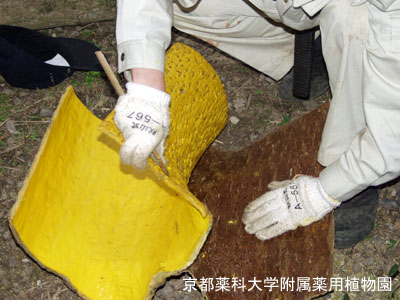 A bark is carefully stripped from body with a bamboo spatula.