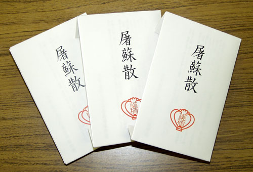 屠蘇散について 屠蘇散は、中国三国時代に華陀という名医が十数種の薬草を調合して、酒に浸して飲んだのが始まりと言われています。 邪気を屠り、魂を蘇らせるところから「屠蘇」と名付けられ、「年の始めにこれを服するときは年中の災厄を避け、福寿を招く。」と伝えられています。 また日本では昔、嵯峨天皇の御代弘仁年間、唐の博士蘇明が和唐使として訪れた際、「屠白散」と称する霊薬を天皇四方拝の儀式に献上したのが始まりと言われています。以後、人々はこれに倣って一年間の健康を祈念する縁起行事としてお正月に屠蘇酒で新年を祝うようになりました。 大晦日の夜、袋ごと、三六〇ミリリットル(約ニ合)のお酒に一夜冷たく浸しておき元旦、雑煮を祝う前に年少者より順次、新年の縁起と長寿を祈念してお祝いします。 |