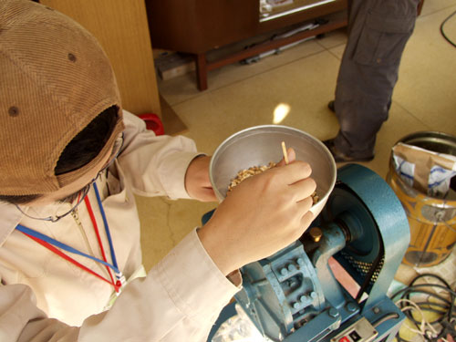 一つの生薬の粉砕が終わるたびに丁寧に掃除します