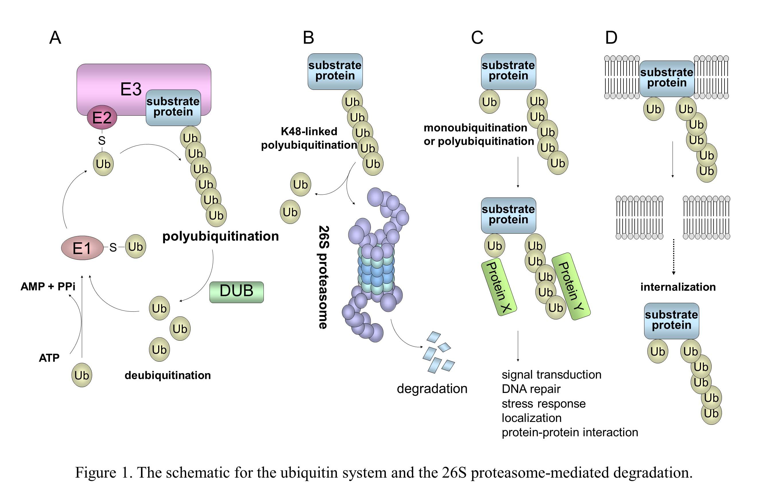 Ubiquitination is a post-translational modification in which one or more ubiquitin molecules are covalently linked to lysine residues of target proteins. The ubiquitin system plays a key role in the regulation of protein degradation, including cell signaling, endocytosis, vesicle trafficking, apoptosis, and immune responses. Bacterial and viral pathogens exploit the cellular ubiquitin system by encoding their own proteins to serve their survival and replication in infected cells. Recent studies have revealed that Kaposi’s sarcoma-associated herpesvirus (KSHV) manipulates cell signaling and the ubiquitin system of infected cells to facilitate cell proliferation, anti-apoptosis, and evasion from immunity.