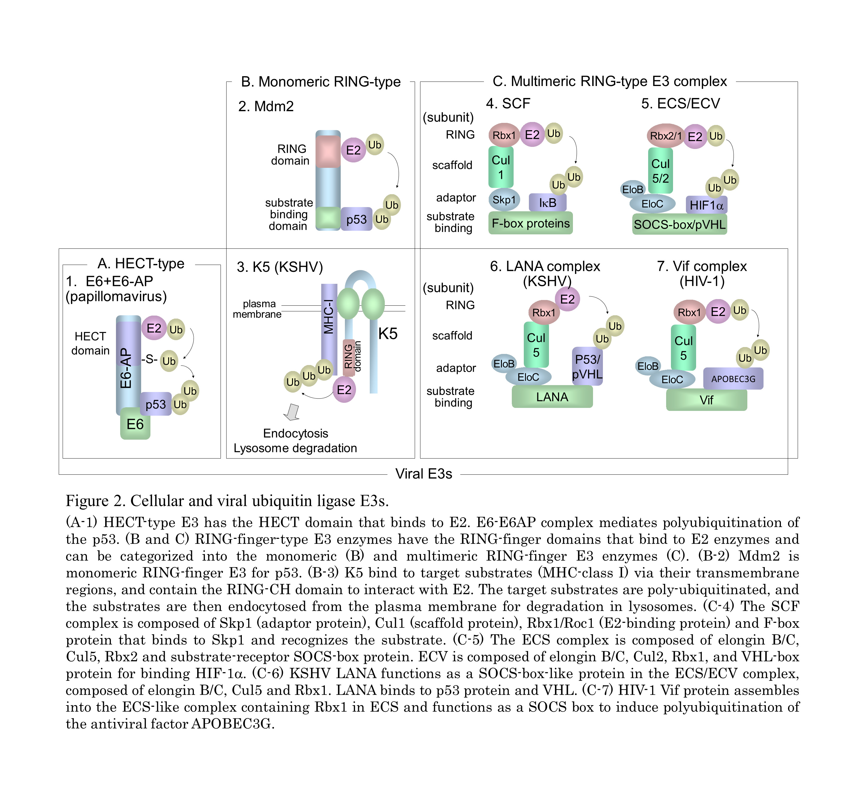 In the ubiquitin system (UPS), a substrate protein is tagged with a polyubiquitin chain or a single ubiquitin molecule via isopeptide bonds that are formed between the carboxyl termini of ubiquitin molecules and either the alpha-amino groups of the lysine residues in the target protein or the ubiquitin molecules themselves (Fig. 1). (A) Ubiquitin conjugation is catalyzed by the sequential actions of ubiquitin-activating enzyme, E1, ubiquitin-conjugating enzyme, E2, and ubiquitin ligase E3. (B) In the case of conjugation with K48-linked polyubiquitin, the polyubiquitinated protein is recognized by the 26S proteasome and is destroyed in an ATP-dependent manner. (C) Modifications of a monoubiquitin and a polyubiquitin chain linked through Lys other than Lys48 (for example, Lys63, Lys11, and Lys29) play a role in many cellular processes, such as signal transduction, DNA repair, and localization through protein-protein interactions. (D) Monoubiquitination and K63-linked polyubiquitination are also involved in the internalization and endocytosis of membrane proteins. It is known that numerous viruses exploit the cellular ubiquitin system in various ways for entry or release of progeny virus and also manipulate this system to abolish cellular defense mechanisms, including apoptosis and the IFN response (Fig. 2). KSHV and HIV-1 utilize the cellular E3 by encoding their own proteins to facilitate cell proliferation, anti-apoptosis, and evasion from immunity.