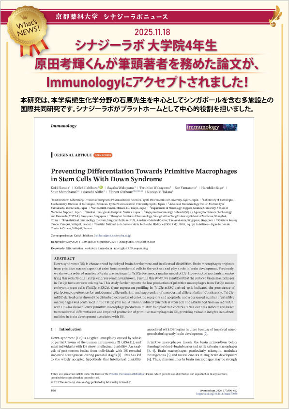 - 2019.6.17 本学病態生化学分野との共同研究で、ダウン症発症への脳免疫破綻の関与を示唆する論文がアクセプトされました。
