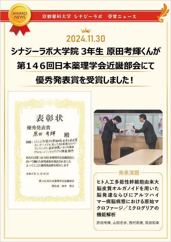 2024.8.29 生体機能と創薬シンポジウム2024京都にて、シナジーラボ大学院3年生、原田考輝君の研究発表が、優秀ポスター発表賞を受賞しました。 |