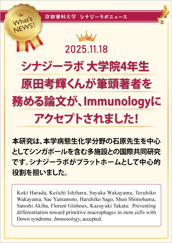 - 2019.6.17 本学病態生化学分野との共同研究で、ダウン症発症への脳免疫破綻の関与を示唆する論文がアクセプトされました。