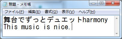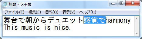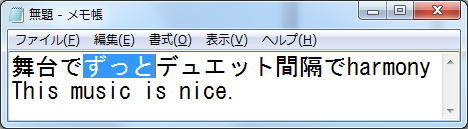 | ☆ 文章の編集 <文字の挿入> まず、下のように「メモ帳」に入力します。 ![]() 「デュエット」と「harmony」の間をマウスでクリックします。 「間隔で」を挿入します。 ![]() <文字の削除> 「Back Space」を押すと、左側の文字が削除され、 「Delete」を押すと右側の文字が削除されます。 文字列をまとめて削除するにはマウスでドラッグし、反転させ 「Back Space」又は「Delete」を押します。 ※ 操作を間違えた場合は「編集」メニューの「元に戻す」を使います。 <文字の置換> 文字列を反転させておいて、文字を打てば文字列が置き換わります。 「ずっと」を「朝から」に変えてみましょう。 ![]() <文字の再変換> 「間隔で」を反転させ、「変換」キーを押せば再変換の候補が現れます。 「感覚で」を選択します。 (マウスの右クリックメニューの「再変換」をクリックしても再変換の候補が現れます) ![]() <文字のコピー、切り取り、貼り付け> 文字列を選んでマウスでドラッグし反転させ、「編集メニュー」から「コピー」をクリックします。 次に貼り付けたい場所をマウスでクリックして「編集メニュー」から「貼り付け」を選べば 文字列がコピーされます。 マウスの「右クリック」でも、「コピー」、「切り取り」、「貼り付け」ができます ![]() 「コピー」や「切り取り」を行うと、クリップボードと呼ばれるメモリ領域に一時的に保存され、 「貼り付け」を行うとそれが取り出されます。 |