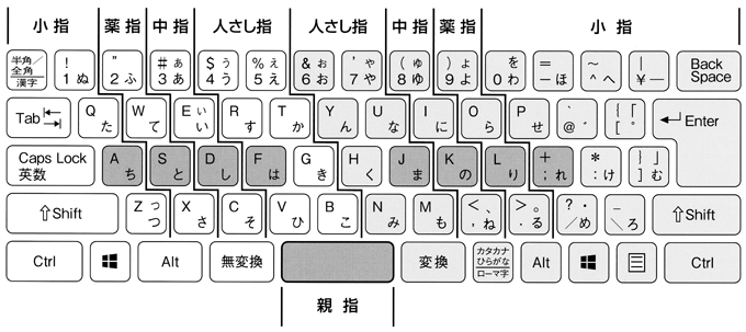 | *タッチタイピングとはキーボードを見ないで文字入力を行うことです。 ホームポジションを基準として、正しい指使いでキーを打っていきます。 左右の手のそれぞれの指がどのキーを打つのかは以下の配列図を参照。 |