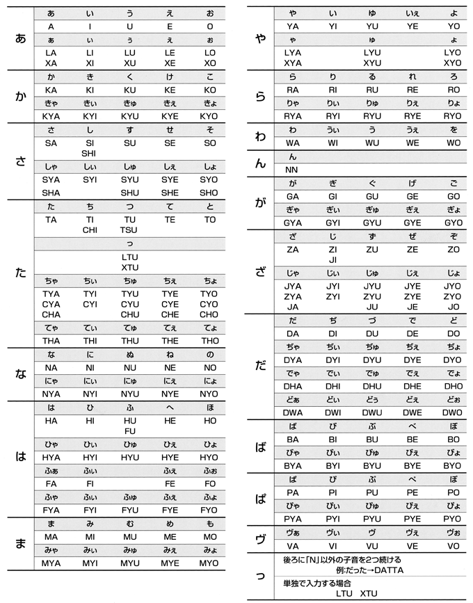 | ローマ字入力(ローマ字・かな対応表) | |