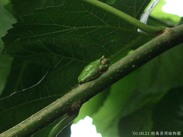 確かに当園でカエルが大量に鳴き出すと雨が降ってきます。ちなみにこの写真は 桑の木の高いところの枝にじーっととつかまっているのを撮りました。