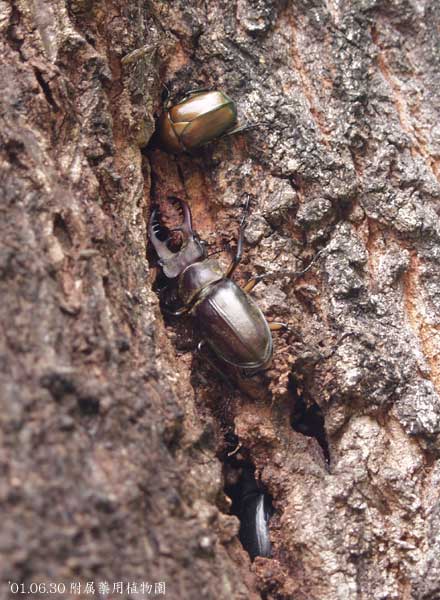 その他、上の方にちょこっととまっているのがカメムシの一種、 下の方の樹皮の割れ目にもぐりこんでいるのがスジクワガタだと思われる。